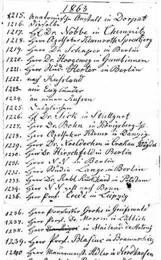 R. Blasius Aus der Werkstätte von F.W. Schiek liegen zwei Listen vor: Eine Kundenliste (1840-1864) mit den Nummern 60 - 1341 sowie eine Auslieferungsliste der Mikroskopseriennummern 1 - 250. Die Kundennummern differieren schwankend bis zu ungefähr 30 Positionen von den Seriennummern der Mikroskope. Daher ist eine genaue Zuordnung der Mikroskope aus der Werkstatt von F.W. Schiek mit Seriennummern über 250 in der Regel nicht möglich. Der oben erwähnte eingeritzte Name ermöglicht jedoch im Fall des hier gezeigten Mikroskops eine eindeutige Zuordnung. In der Kundenliste Schieks erscheint als laufende Nummer 1239: Herr Prof. Blasius in Braunschweig.